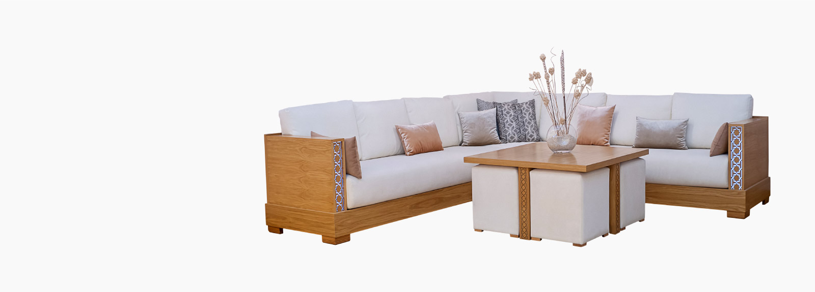 Mobilier de salon marocain en bois avec motifs ajourées à composer avec plusieurs éléments : Structure du socle en bois massif hêtre ou en chêne, assise (Banquettes à ressorts ou en mousse polyuréthane haute résilience ‘HR’), garnissage coussins de dossier en ouate en boule de qualité supérieure et des housses de rembourrage spécial microfibres, piètement en bois massif hêtre ou chêne teinté et verni, mat, satiné ou brillant.