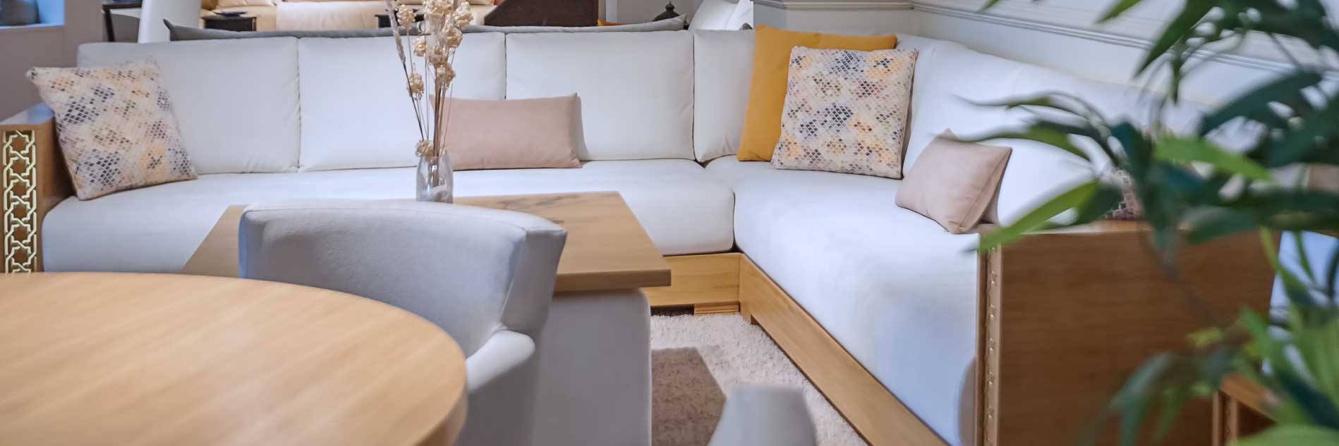 Mobilier de salon marocain à composer avec plusieurs éléments : Structure du socle en bois, assise (banquettes en mousse haute résilience ‘HR’ et haute densité ‘HD’), garnissage des coussins de dossier en fibre de boule siliconée avec des housses de rembourrage.