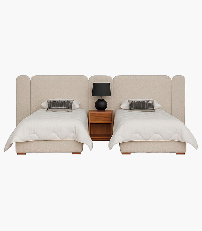 Tête de lit et sommierenbois, sommierdémontable (deux caissesséparées) avec des lattes enbois, un plateau en MDF revêtu, toile antipoussière, une table de chevet avec un tiroir