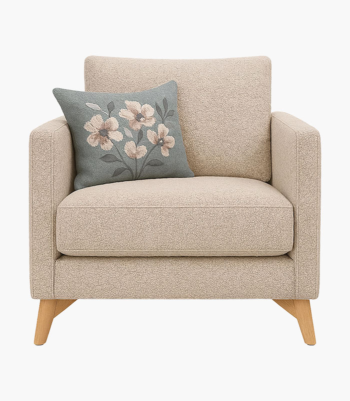 Rembourrage en mousse. Coussins d’assise en mousse HR, suspension par sangles. Tis su anti-tâche. Structure en bois