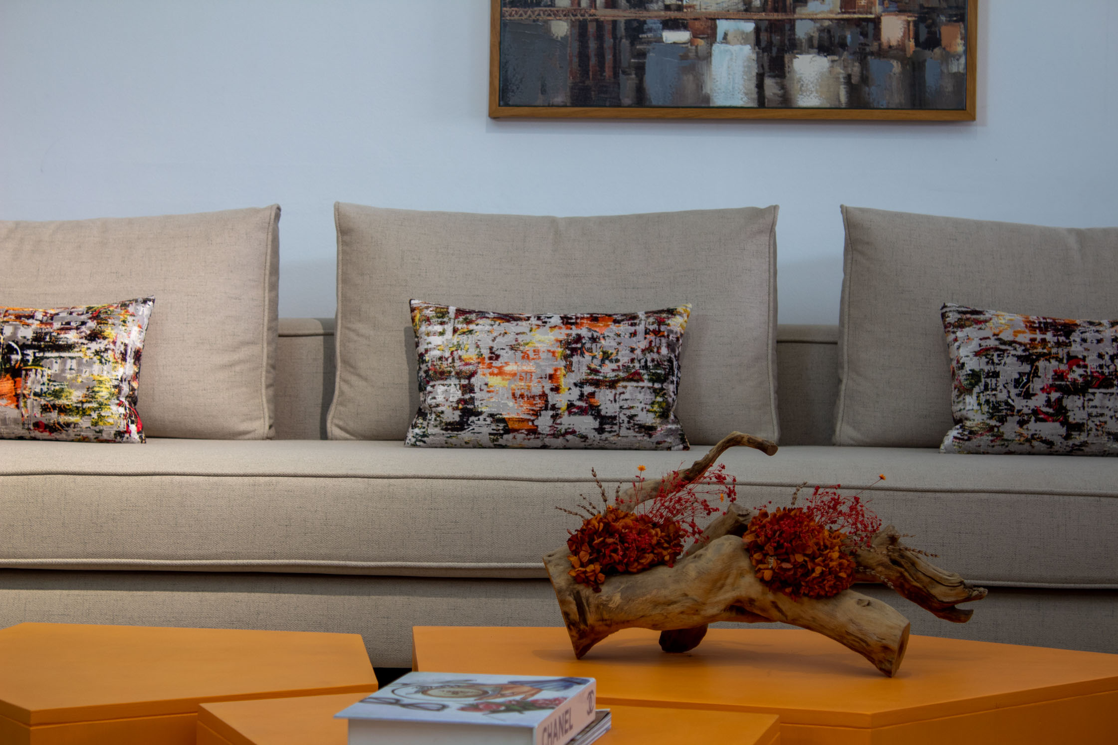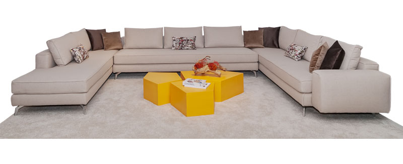 Canapés modulables à composer avec plusieurs éléments. La structure du gabarit est en bois, coussins d’assise en mousse polyuréthane haute résilience ‘HR’, suspension par sangles élastiques entrecroisées, toile de fond antipoussière, rembourrage en mousse haute densité, garnissage coussins de dossier en ouate en boule avec velcro adhésif avec des housses de rembourrage en microfibres.