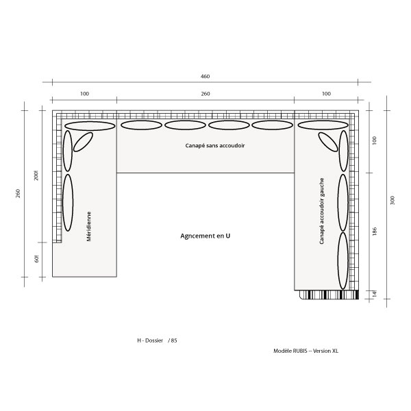 • Éléments : canapé modulable accoudoir, canapé modulable sans accoudoir et une méridienne,