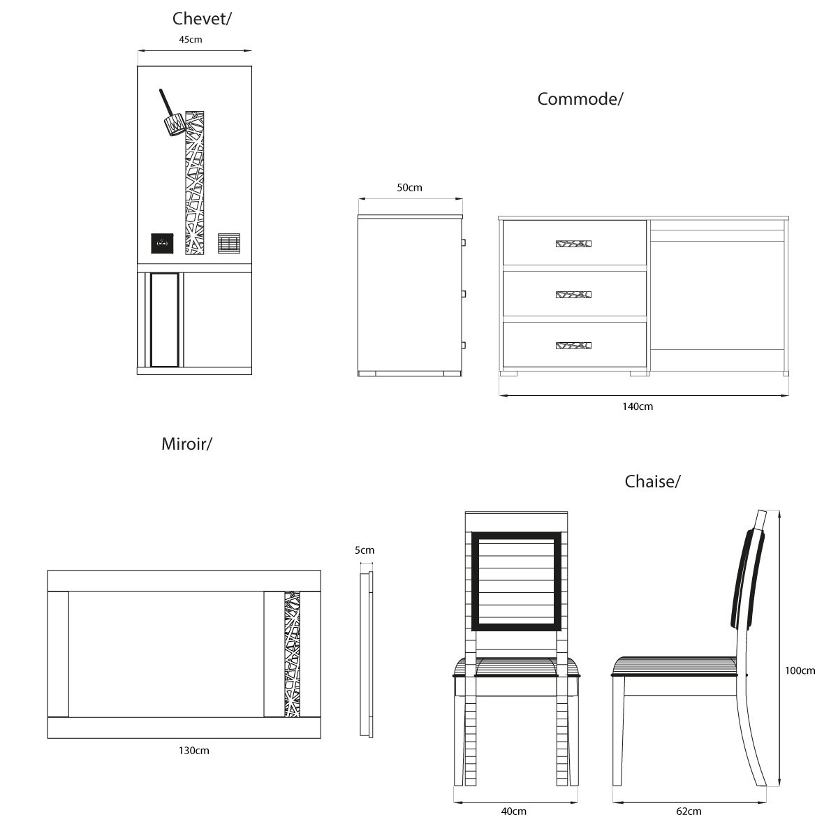 Spécification Chevet Commode Miroir Chaise