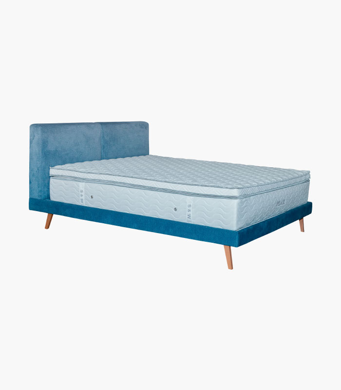 Tête de lit enboistapissé avec habillagearrière, sommierdémontable (uneou deux caisses) avec des lattes enbois, un plateau en MDF revêtu, toile antipoussière et deux tables de chevet avec un tiroir.