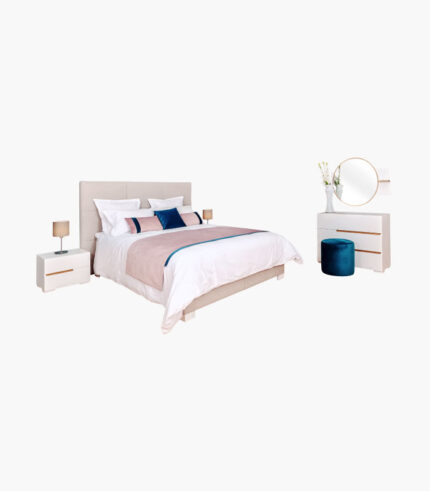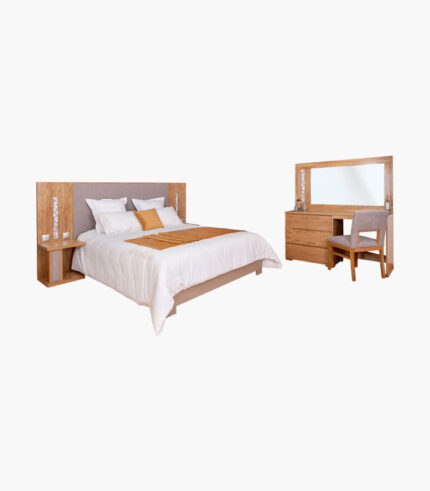 Tête de lit enboistapissé avec habillagearrière, sommierdémontable (uneou deux caisses) avec des lattes enbois, un plateau en MDF revêtu, toile antipoussière et deux tables de chevet avec tiroir.