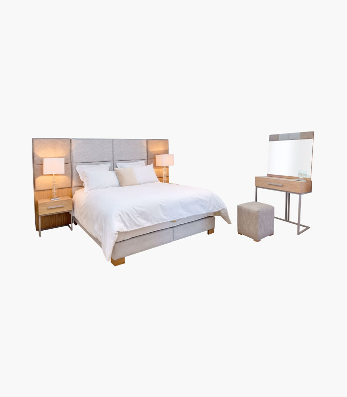 Tête de lit enbois avec panneauxtapisséscontrecollé et habillagearrière, sommierdémontable (uneou deux caisses) avec des lattes enbois, un plateau en MDF revêtu, toile antipoussière, deux tables de chevet avec un tiroir, une commode avec un tiroir, un pouf et un miroir. Possibilitéd'ajouter deux extensions enbois apparent plaquéchêne à la tête de lit.