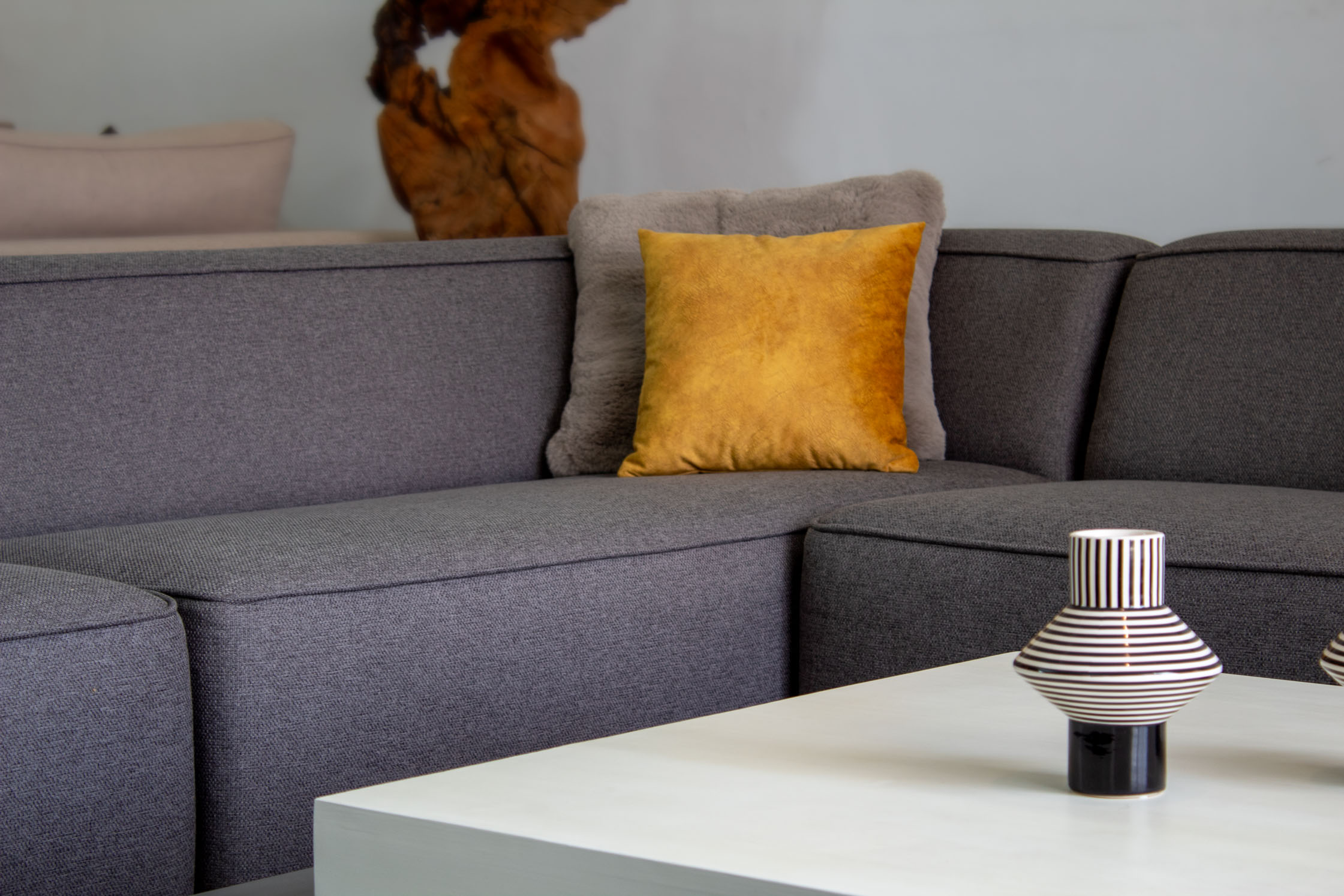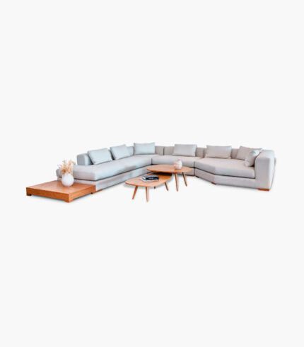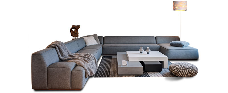 Canapés modulables à composer avec plusieurs éléments. La structure du gabarit est en bois, assises en mousse polyuréthane haute densité ‘HD’, suspension par sangles élastiques entrecroisées, toile de fond antipoussière, rembourrage en mousse haute densité.