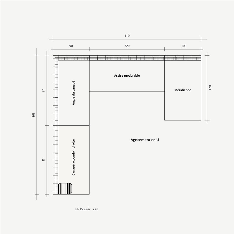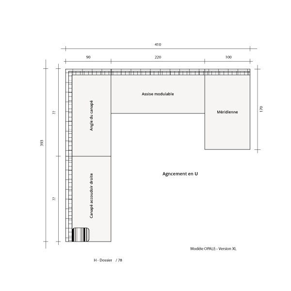 • Éléments : canapé modulable accoudoir droite, angle du canapé, assise sans accoudroir modulable et une méridienne,