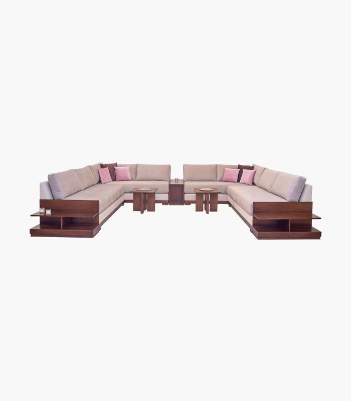 Mobilier de salon marocain avec bois apparent à composer avec plusieurs éléments : Structure en bois massif, surface latérale du socle tapissée, assise (banquettes en mousse haute résilience ‘HR’), garnissage coussins de dossier en ouate en boule de qualité supérieure et des housses de rembourrage spécial microfibres, piètement en bois massif hêtre ou chêne.