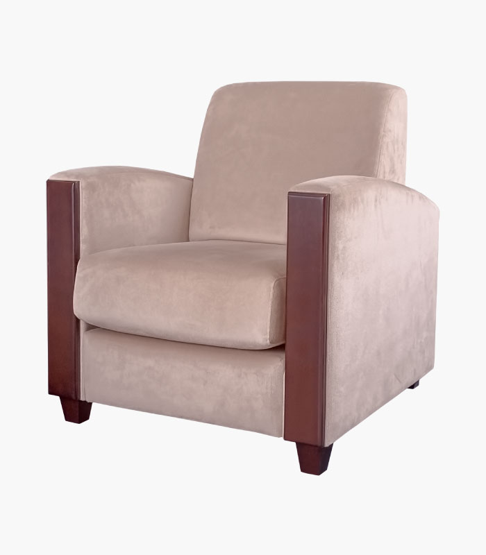 Rembourrage en mousse. Coussins d’assise en mousse HR, suspension par sangles. Tis su anti-tâche. Structure en bois